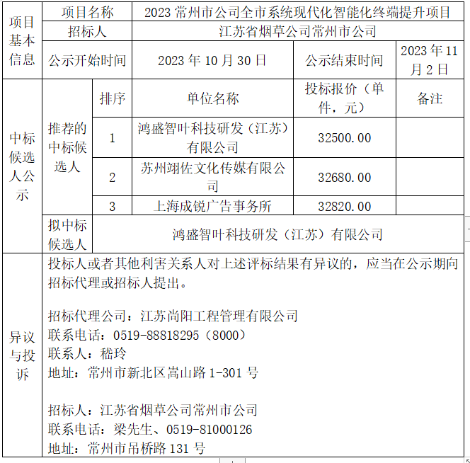 2023常州市公司全市系統(tǒng)現(xiàn)代化智能化終端提升項(xiàng)目中標(biāo)候選人公示