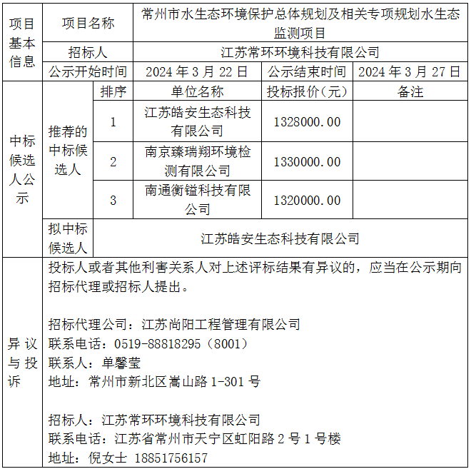 常州市水生態(tài)環(huán)境保護(hù)總體規(guī)劃及相關(guān)專項規(guī)劃水生態(tài)監(jiān)測項目中標(biāo)候選人公示