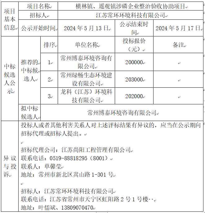 橫林鎮(zhèn)、遙觀鎮(zhèn)涉磷企業(yè)整治驗收協(xié)助項目 中標候選人公示