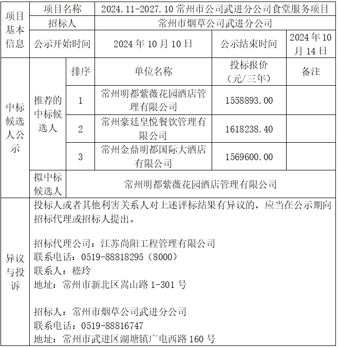 2024.11-2027.10常州市公司武進分公司食堂服務(wù)項目中標候選人公示