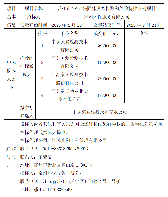 常州市ZP地塊固體廢物檢測和危險(xiǎn)特性鑒別項(xiàng)目成交候選人公示
