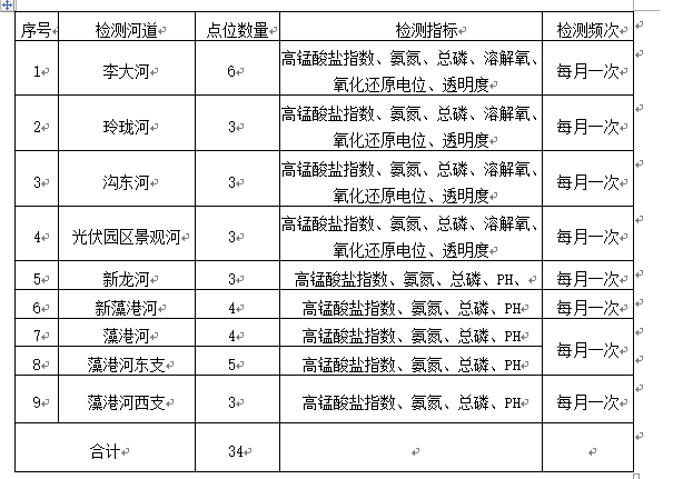 9條河34個點(diǎn)位,監(jiān)測頻次和時間:1年,每月1次,出具監(jiān)測報(bào)告及季度與年度水質(zhì)分析報(bào)告。