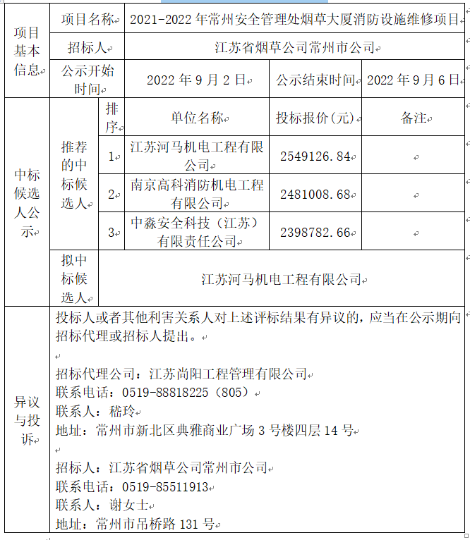 2021-2022年常州安全管理處煙草大廈消防設(shè)施維修項目中標候選人公示